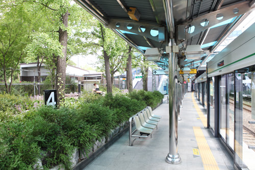 站台一旁设置有大大的长椅,经常可以看见与朋友、恋人一起聊天的人,也有独自思索的人。这里的站台位于地上,阳光十分充足,沿着散步小道走过去,仿佛置身于偌大的户外公园般惬意。