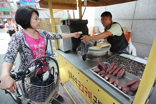 地铁站附近的街边摊上已经开始卖煮红薯、鲫鱼烧了。这些秋冬季的街头小吃散发着香喷喷的味道,预示着秋天的开始。