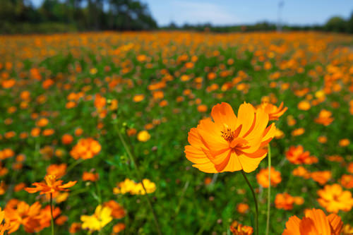 在园地周围是几乎看不到高树的,盛开的黄波斯菊沐浴着洒下的阳光,释放出动人的色彩。