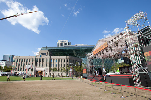 首尔广场的工作人员正在为晚上8点盛大举行的开幕式而忙碌。以首尔市厅办公楼为舞台投影的影像也是很大的看点。
