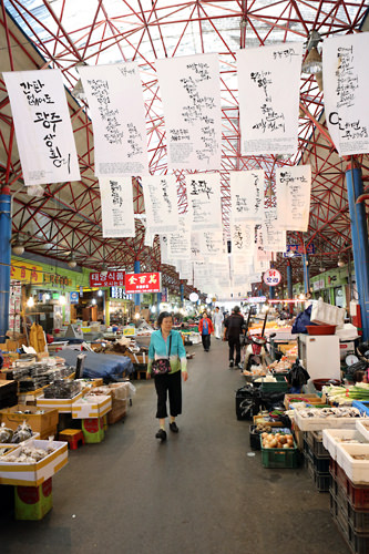 首尔中央市场就位于地铁2号线新堂洞站的北侧。市场内的顶部悬挂着以“黄鹤洞别曲100人的故事”为主题的书法作品,内容是将市场商人们的故事汇编而成的诗歌。