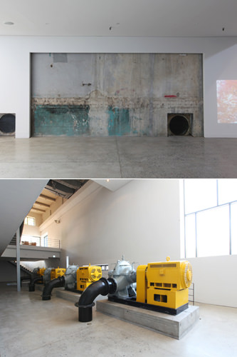 地下1层曾是净水厂送水设备室,以前使用过的送水管道孔和抽水机(下图)依然保持着原貌。