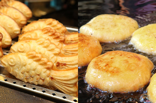 最能勾起人们食欲的便是用面粉、白糖和鸡蛋加上红豆等馅料放在鲫鱼模型中烤出的鲫鱼烧(左)、以及加入肉桂和坚果(有时会加入炒杂菜等馅料)煎制而成的甜饼(右)。