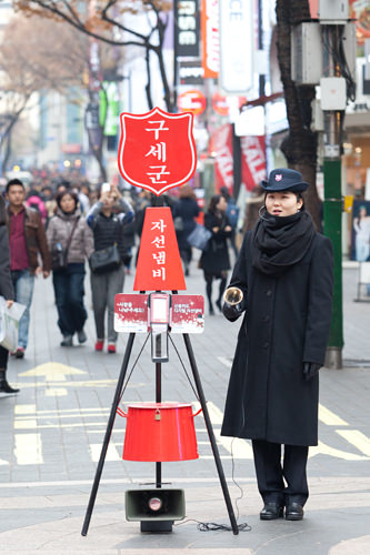 今天起,明洞的中央大街上出现了“红铁锅”,十分引人注目。这是已有85年历史的救世军“慈善锅”募捐活动,筹集的捐款将用于建设福利设施及帮助多文化家庭等。