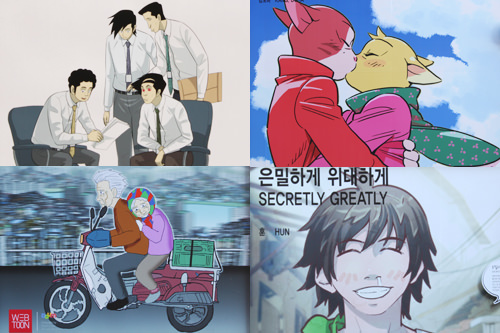 一走进“趣味路”,各种被以电影和电视剧形式搬上荧屏的漫画作品画面便跳入眼帘,像《未生》、《伟大的盖茨比》、《隐秘而伟大》、《我爱你》(按顺时针方向)以及《食客》和《传说的拳头》等广为人知的作品宣传照片都可以在这里看到。