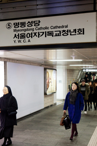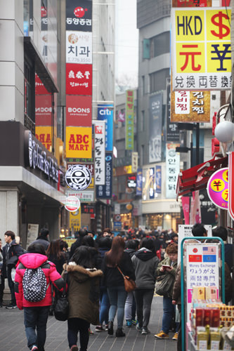 首尔最繁华的购物街区明洞距离地铁4号线和2号线都很近,附近又有众多高档酒店环绕,因此人们经常可以看到提着大包小包行李的外国人。