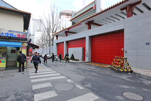 大使馆的外围大门也是中国象征喜庆的大红色,上面呈中国传统式的琉璃瓦造型,整体看起来气派、肃穆又不失中国特色。门前的这条小路上有许多民间换钱所,托着位于大使馆对面的福,这家换钱所取了“大使馆前换钱”的店名。
