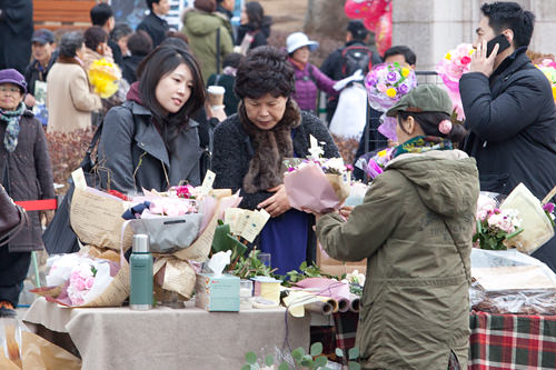 2月是韩国的毕业季!各大高校的毕业典礼都在第2周到第3周期间举行。韩国的毕业典礼上不能缺少花束,地铁站前和大学周围出现的很多卖花束的摊子,成了这个时期一道亮丽的风景线。