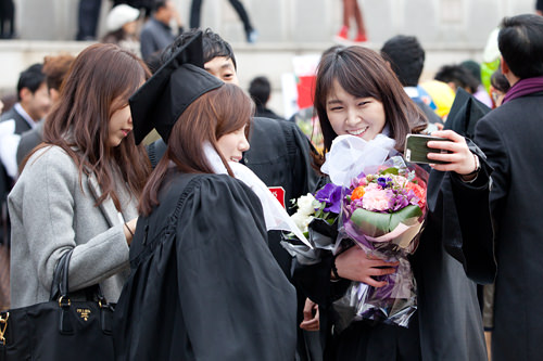 毕业典礼结束后,毕业生们为了留下最后记忆而在校内各个角落拍照留念。手拿各式各样的花束,和一同度过美好青春时光的朋友们拍摄学生时代最后的自拍照。