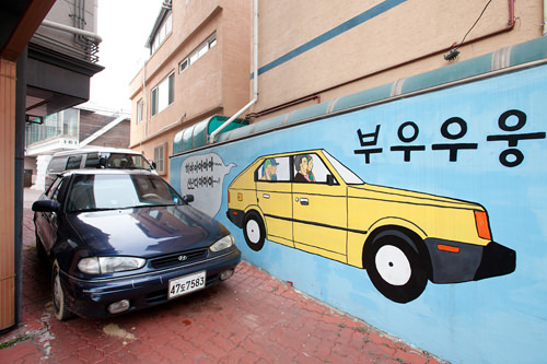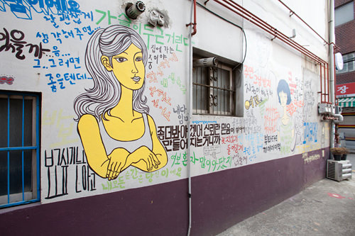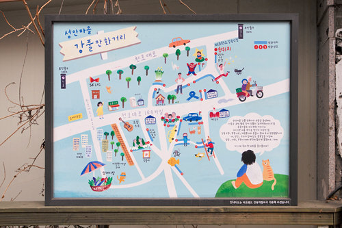 从地铁5号线江东站4号出口出来步行约5分钟就能看到一系列的温情漫画,这些都是出自韩国著名网络漫画家姜草(Kangfull)的人气漫画作品。进入小巷后,第一个映入眼帘的便是2010年的作品《你的所有瞬间》。