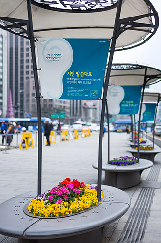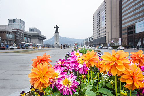 从上周末开始,首尔的天气终于逐渐暖和起来。在首尔中心地区的光化门广场上,不少花儿已经迫不及待地开放,将初春的首尔打扮得绚丽缤纷。