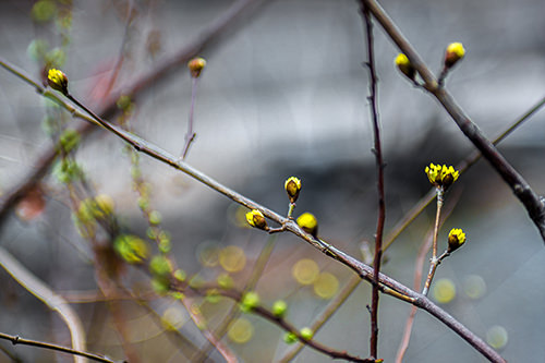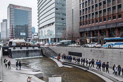 光化门附近的清溪川也在暖暖的春风中焕发出新的光彩。不知何时已爬上枝头的山茱萸花骨朵,嫩嫩的黄色让人们感觉到真正的春天已经越来越近了。
