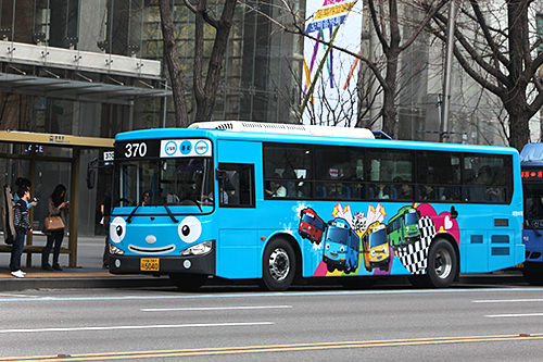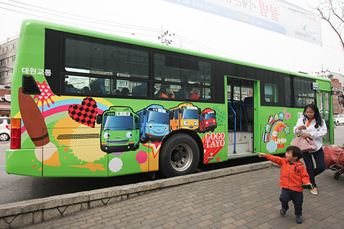 韩国EBS电视台目前正在热播的动画片《小巴士汽车Tayo》里的卡通形象,活生生地出现在首尔街头了。前不久,为迎接3月26日的“公共交通日”,韩国巴士运输事业联盟与动画片制作商ICONIX公司联合运行共4辆卡通巴士,乘客们大赞新奇又可爱。