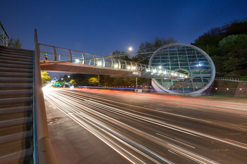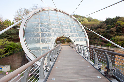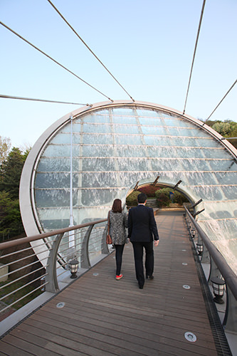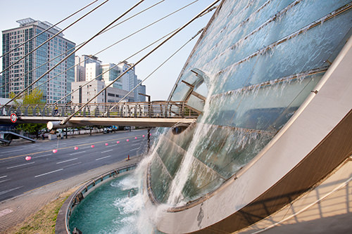 水幕艺术天桥始于2004年,由建筑设计家David・Pierre Jalicon进行设计规划,凭借其结合法国建筑艺术风格与韩国风水地理学传统的设计获得法国艺术学院建筑大奖。