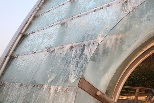 为了不切断在风水地理学上要穿过山的气运,特以圆盘形和阶梯式的设计将这气运自然承接,顺应地形,看上去十分独特。在温暖的季节,圆盘上的287个喷头喷水形成流动的水幕瀑布,清凉的空气从水幕四周蔓延。