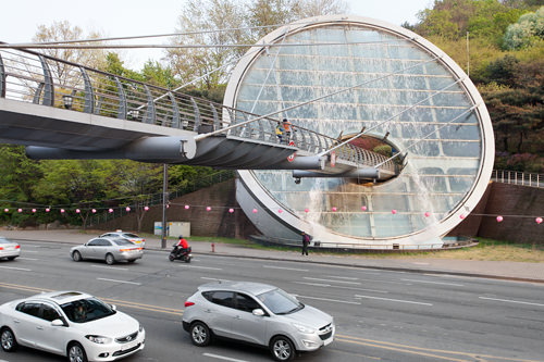韩国首个水幕艺术天桥于今年3月开始启动。天桥位于常年进行歌剧或艺术展的“艺术殿堂”前,长50米、宽3.2米、高6.3米,造型十分独特,这吸引了很多人前来观赏。
