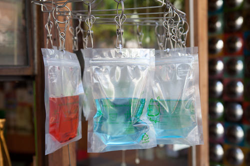 最近在韩国大街上,经常会看到用透明袋装的饮料。从果汁、咖啡到含酒精饮品,种类也很多样。因其在携带和饮用方面都非常方便,在韩国年轻人之间有着较高的人气。