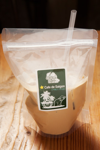 在以刨冰闻名的东大门人气咖啡厅“北海冰水”销售的透明袋装咖啡,是曾在越南生活的店主将在越南深受欢迎的饮料嫁接到最近流行的透明袋包装中的咖啡。因放入了大量牛奶,口感非常醇厚。