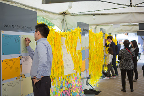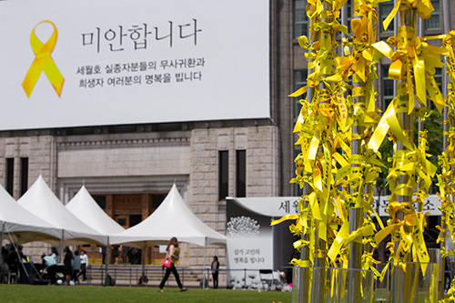 首尔广场灵堂前的图书馆外墙上挂着印有“对不起”的横幅。事故发生后,不正确的初期对应、船舶公司管理体系漏洞百出等多种理由,导致了更大的损失。韩国国民们因没有保护好年轻的生命而感到深深的愧疚。