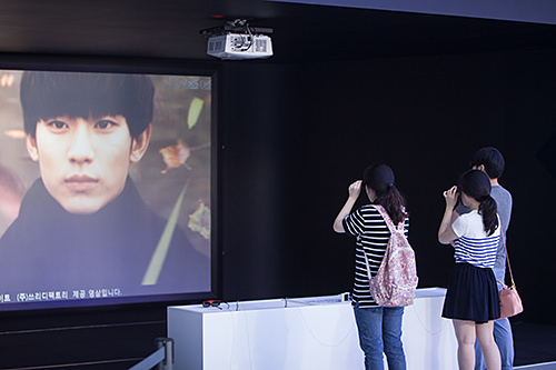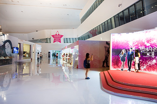 大家在那么聚精会神地看什么呢?原来这里在用大屏幕播放《来自星星的你》的3D视频,让你身临其境完全走进剧中,一切都那么栩栩如生。看到高大帅气的金秀贤欧巴宛如真人站在自己面前时,不要心跳太快哦!