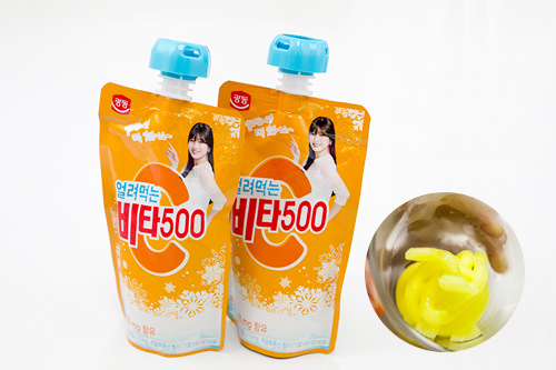 韩国广东制药出品、人尽皆知的“维他500”,以前都只有深褐色玻璃瓶装,今年新推出便于冰冻的口吸袋装产品,并在包装袋上就写着“冰冻吃的维他500”,放冷冻室一段时间后,吃起来就如同吃冰沙一样爽。