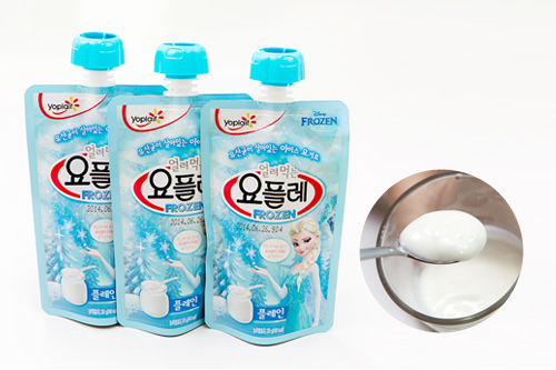 著名的宾格瑞集团旗下的“yoplait"也推出了“冰冻吃的酸奶“,同样是专门用于冷冻的口吸袋式包装,加上冰天雪地般的画面设计和《冰雪奇缘》里的卡通人物,单从外观就给人冰爽透心的感觉。