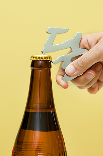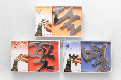 这完全不同于普通开瓶器的模样,怎样开瓶呢?原来,它是利用韩文构造的巧妙,用上面的笔画压住瓶盖,再用下面笔画的收尾笔锋部分作为撬开瓶子的利齿,操作起来轻松顺手。