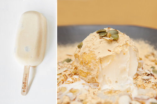 除了刨冰,众多冰淇淋店也纷纷推出豆粉新口味,如位于弘大的“molly's pops”豆粉味冰淇淋(左图,3,500韩元),“GAONGILL”红豆刨冰咖啡厅的豆粉年糕冰淇淋(右图,6,200韩元)都备受欢迎。