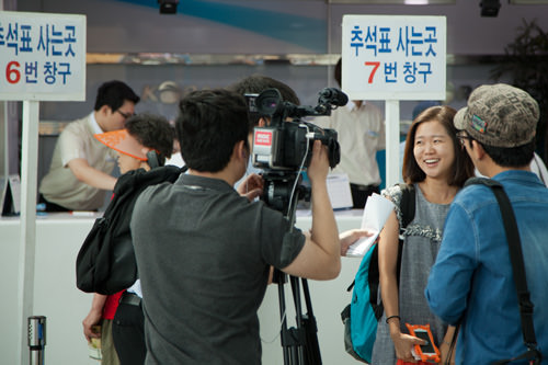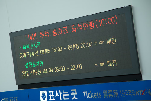 由于今年韩国实行调休制度,这个中秋节将有长达5天的法定假期,因此在此期间回家乡探亲的人预计比往年会有大幅增加。买票的人们及售票的工作人员,大家辛苦了!