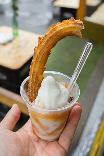 在外国美食店林立的梨泰院,有一个能够品尝到正宗西班牙传统小吃——吉拿果的小摊“STREET CHURROS”。这里的招牌餐品是吉拿果+苹果肉桂冰淇淋套餐(5,000韩元),热乎乎的吉拿果蘸着冰凉透心的冰淇淋,暖、冷、甜、香,口感丰富。