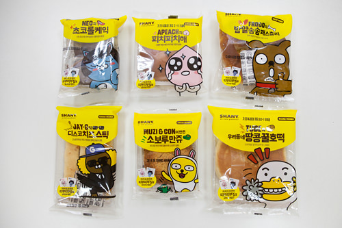 这6种分别是甜饼面包、巧克力卷、菠萝包、桃子酱面包、奶酪棒和栗子油酥包。据称在开发此商品时,主要听取了经常使用KaKaotalk的年轻人和家庭主妇的意见。