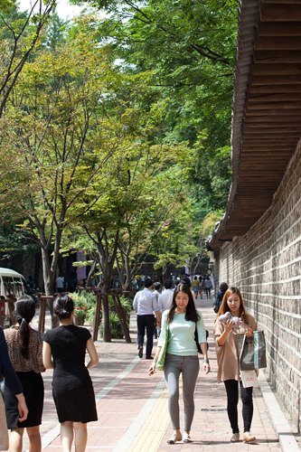 德寿宫石墙路是以承载了朝鲜王朝历史的石墙和美丽的银杏树而闻名,被誉为“韩国最美的路”。石墙路四季风景不同,尤其是秋季会有层次分明的枫叶美景。而靠近市厅的位置也让人们能在休闲之余随时过来走一走。