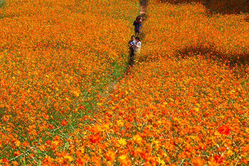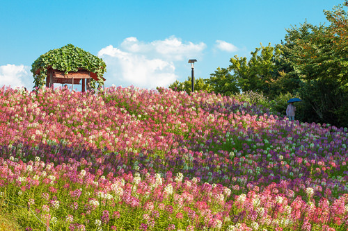 位于首尔市松坡区的奥林匹克公园内有很多的波斯菊。而随着秋日渐深,蓝色高远的天空下大片的黄色花田构成的图画让人不禁沉醉。