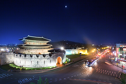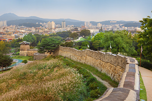 水原华城位于离首尔驱车约1个小时的地方,是世界教科文组织指定的世界文化遗产。城郭总长约5.7千米,面积1.2平方千米,城内城外都布满了紫芒之类的植物,一到秋天便格外美丽。