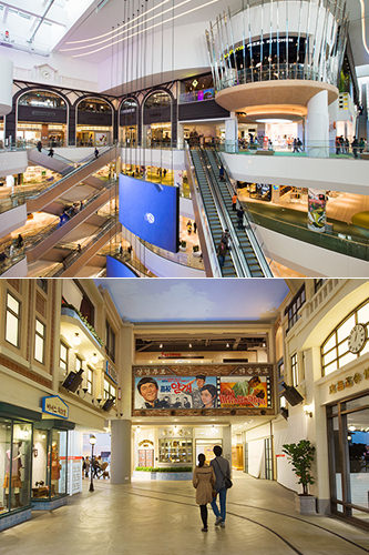 玻璃幕墙的乐天购物中心大厦,则收入了ZARA、H&M等人气SPA品牌及各种男女时装老少时装,是乐购一族们逛街的天堂。逛累了,可以去位于5层的美食街,那里不仅有各种美味,而且还通过复古式的装修风格再现了20世纪30年代的钟路及60~80年代的明洞大街,让人恍如穿越了时光。