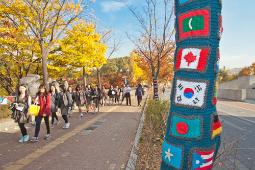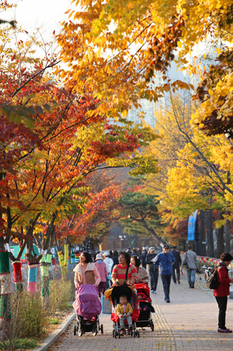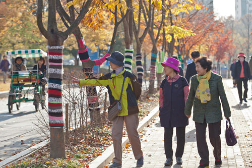 走在秋末冬初的奥林匹克公园里,你会惊喜地发现在用红黄色渲染的晚秋主色调中,多出了许多五颜六色的鲜亮色彩。沿途约1千米的路道上,大树们穿上了漂亮的毛衣,宛如在进行着一场特别的时装秀。