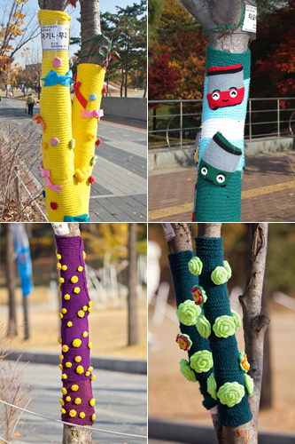 这些大树们穿着的毛衣有鹅黄色、大红色、翠绿色、宝石色、亮紫色等,都是与季节逆反、充满朝气的色彩。有的被嵌上可爱的圆球球和蝴蝶结、有的被织成卡通花纹,简直可以与人们穿的毛衣媲美。