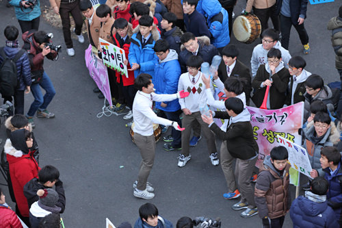 不过,围聚在考场的学弟学妹们用热情的打气加油声将寒冬的冷气全都驱散了。举着各式各样的横幅击鼓呐喊,声势浩大的应援声引得周围的行人纷纷停下脚步观看!