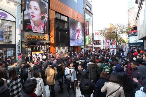 平时就很热闹的明洞主街上,自今天中午起涌来了更多的人流。无论男女老少都聚集在这里,把道路围得水泄不通。大家都在等谁?