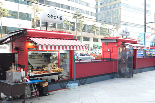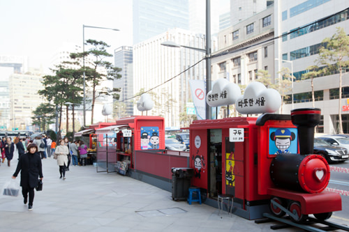 前不久,在明洞乐天百货店总店前大街的路边上突然出现了一排红色的小火车。这些小火车是用来做什么的呢?
