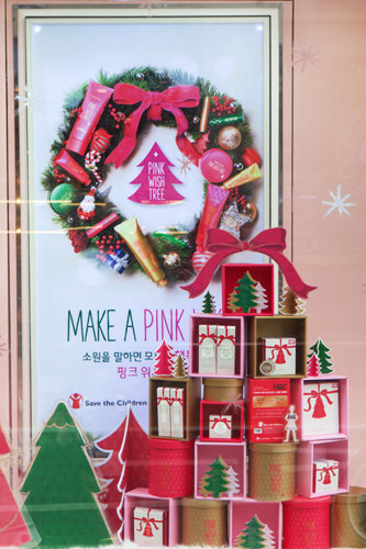 以甜美公主风深受韩国少女们喜爱的伊蒂之屋,在今年圣诞节爱心推出“粉红愿望树”活动。只要购买“粉红愿望树”系列产品,就会自动捐出100韩元,资助非洲失学少女。产品包括了胶原蛋白面霜、黄油护手霜、珍珠亮白气垫粉饼等人气产品。
