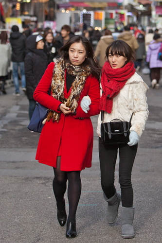 今年,预计厚实时髦的高统雪靴也会流行。因为冬天的首尔路滑,容易摔跟头,所以穿一双底部有防滑垫的鞋非常重要。时尚感十足的雪靴搭配紧身裤或者短裙都很不错。在首尔街头,能够经常看到如此搭配的年轻人们。
