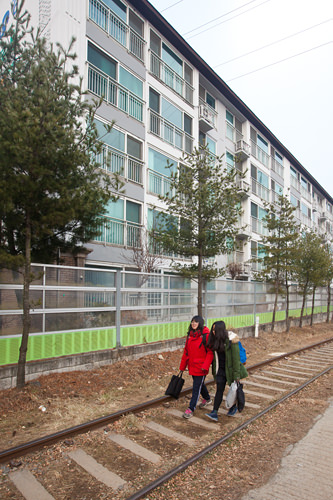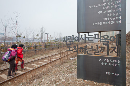 航洞废铁轨周边有许多公寓和学校,正值放学时间,能见到孩子们慢悠悠地走在旧铁轨上。发展迅速的现代和有时代背景的旧铁轨共存在这同一时空。