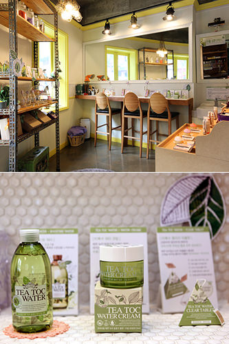 使用茶的天然成分制作化妆品的品牌“a;t fox”在弘大经营着一家同名茶主题美妆咖啡厅。在这里可以自由地试用并购买纯天然化妆品。含有绿茶成分的化妆品系列(下图)既能保湿也有清洁毛孔的效用。