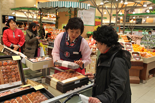 走进超市,包装精美的各种礼物销售对抗战正在炙热地进行。从水果、食品、保健品到生活用品等,一应俱全。销售员们也都穿上了美丽的韩服。