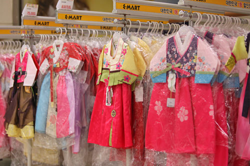 平时不多见的儿童韩服也出现在超市、百货店里显眼的地方。很多家长带着孩子来试穿、挑选,以在春节穿上传统的服装隆重过节。