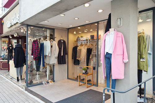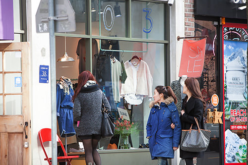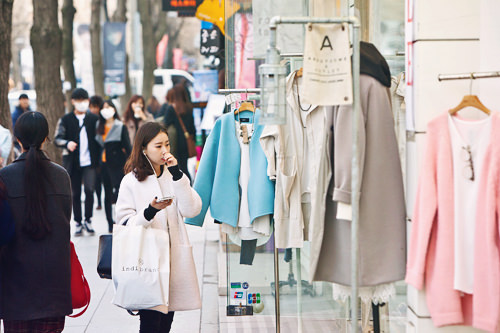 服装店前春装已经挂上,休闲白衬衫、牛仔裤吸引了人们的视线。粉红的的外套让人眼前一亮,春天的色彩渐渐在首尔漫延开来。