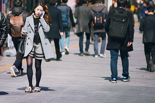 虽然早晚温差很大,还有些寒冷,但是充满活力的女大学生们很多都穿着短裙和薄衫,享受着春天的时尚。