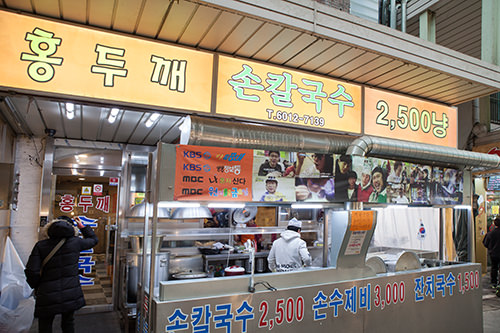每日中午座无虚席的“棒槌手工刀切面”店里的代表菜单手工刀切面只收2,500韩元/1碗!现场制作出的手工刀切面和醇厚的汤底融合在一起非常美味。除了手工刀切面以外,店里还有疙瘩汤 (3,000韩元)和素面(1,500韩元)。