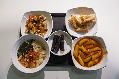 代表菜单糖醋肉只售1,500韩元!炸得脆脆的、肉汁饱满的糖醋肉让人大感满足。糖醋肉、煎饺、辣炒年糕、紫菜包饭、素面(从左上开始顺时针方向)5种加起来6,000韩元的套餐足够两个女生享用了。